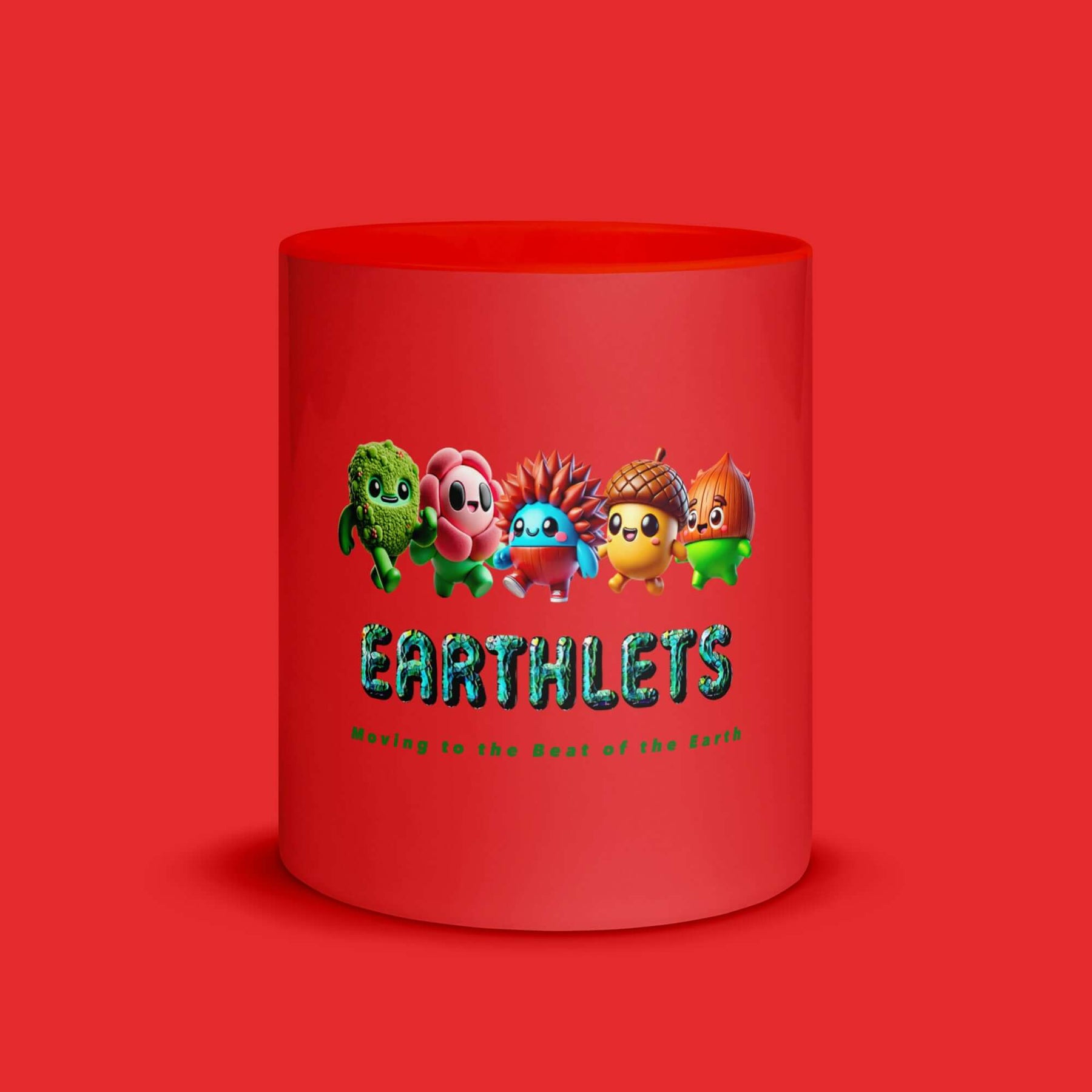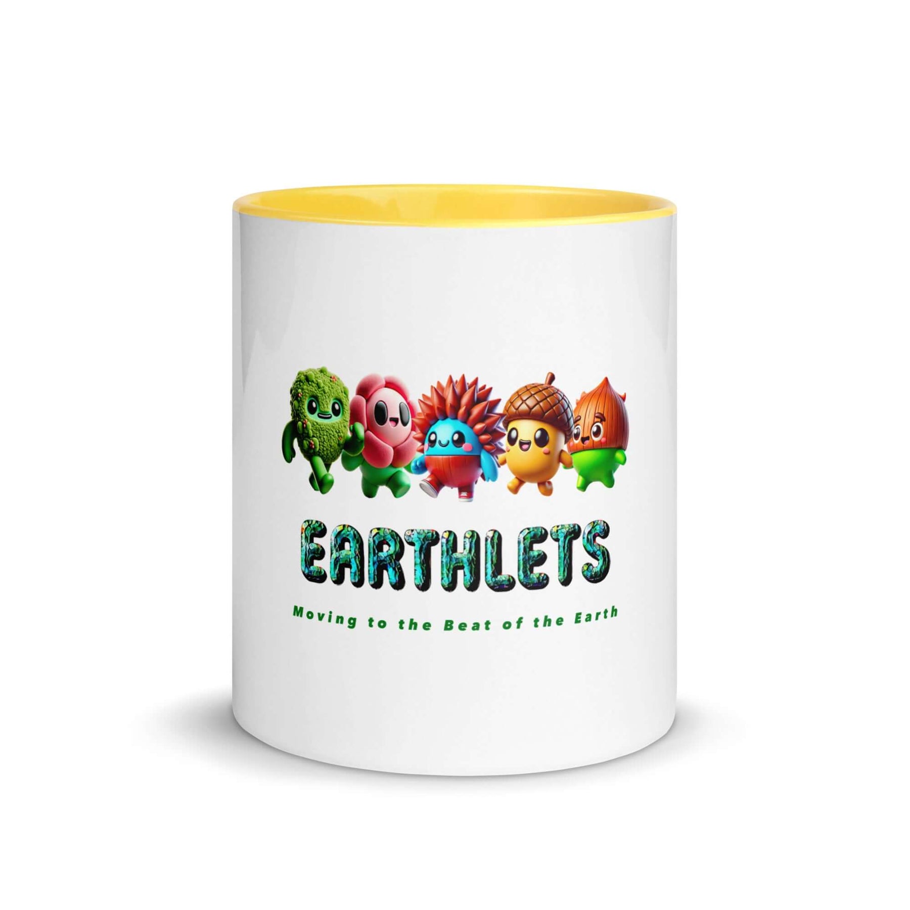 Earthlets mug with colorful interior featuring cute characters and text 'Moving to the Beat of the Earth'.
