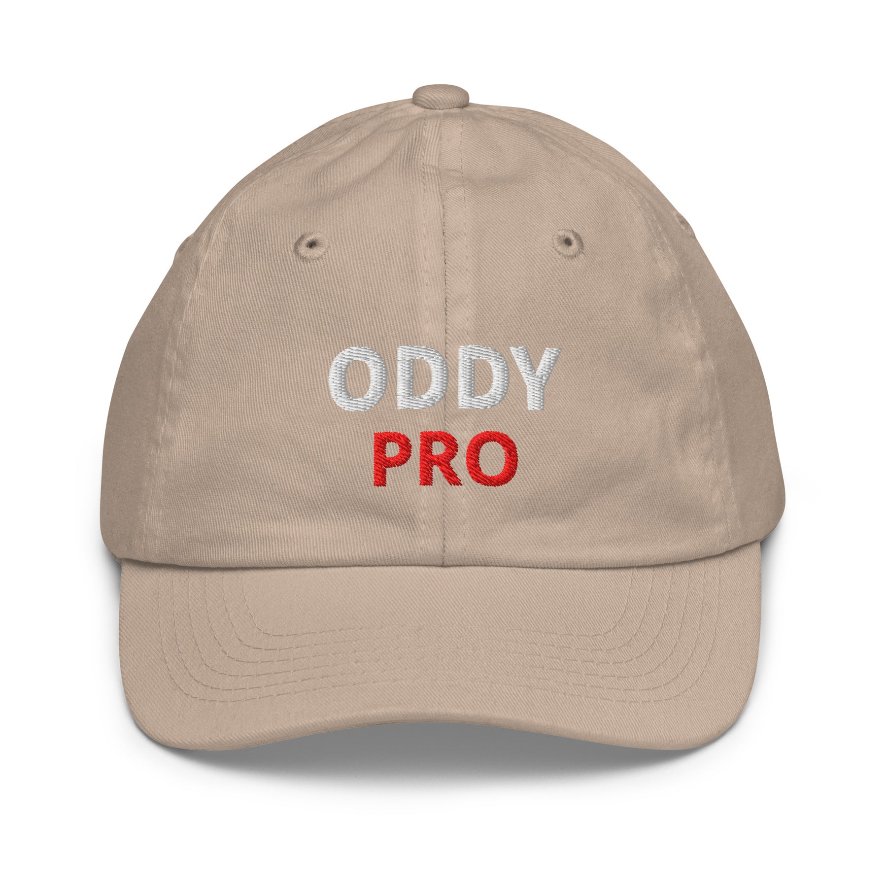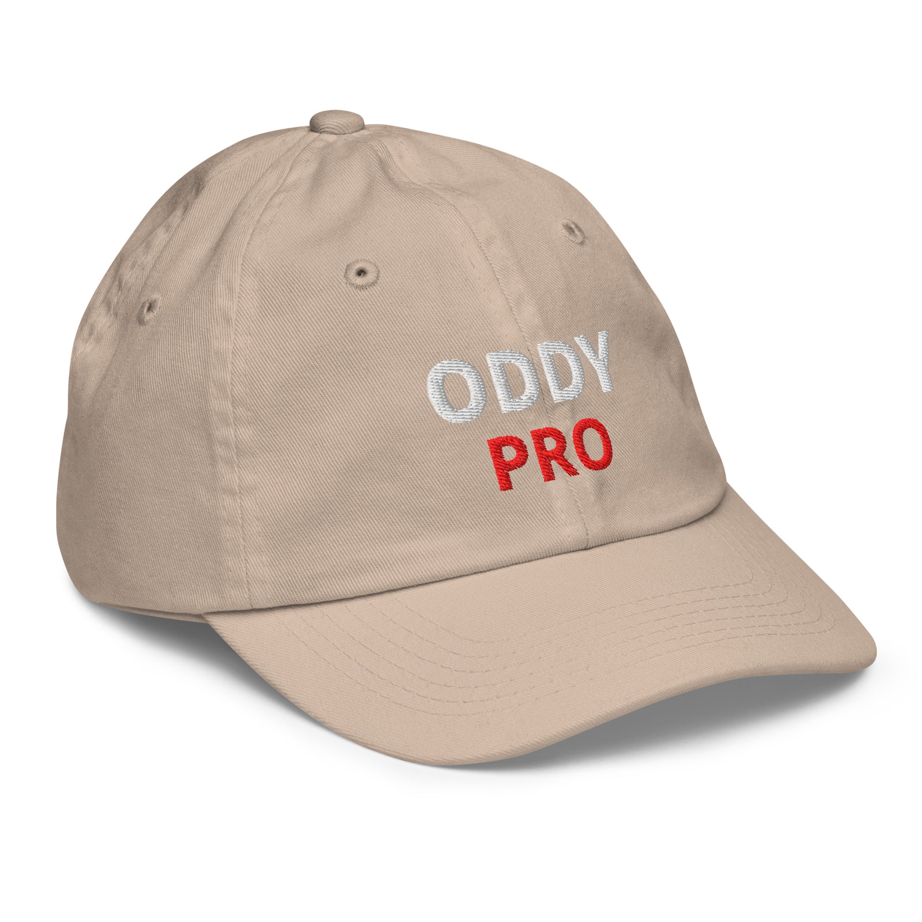 Oddy Pro Youth baseball cap with embroidered design in beige color, perfect for sports and casual wear.